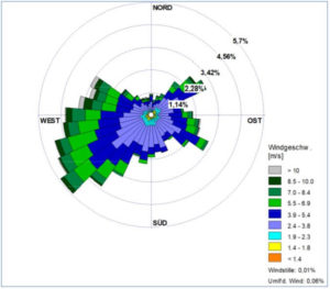 Abbildung 1: Richtungsabhängige Verteilung der Windgeschwindigkeiten, Station Trollenhagen, Zeitraum 01.01.2019 – 31.12.2019